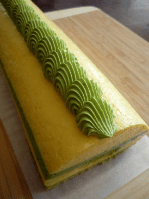 抹茶のスポンジ生地を土台に、抹茶のアングレーズソースに少しゼラチンを入れて固めたクリームと、マンゴーのババロアを合わせました。