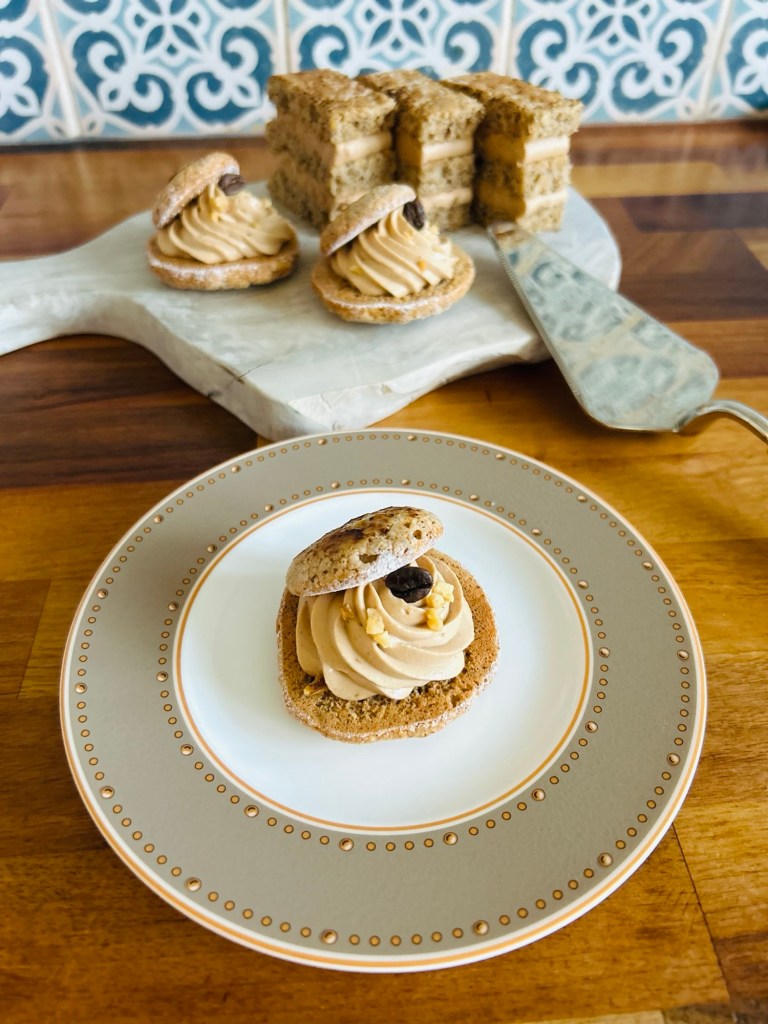 18cmのパウンドケーキを一本お持ち帰りいただき、試食ではプラリネクリームを使ったミニケーキをご試食いただきたいと思います。