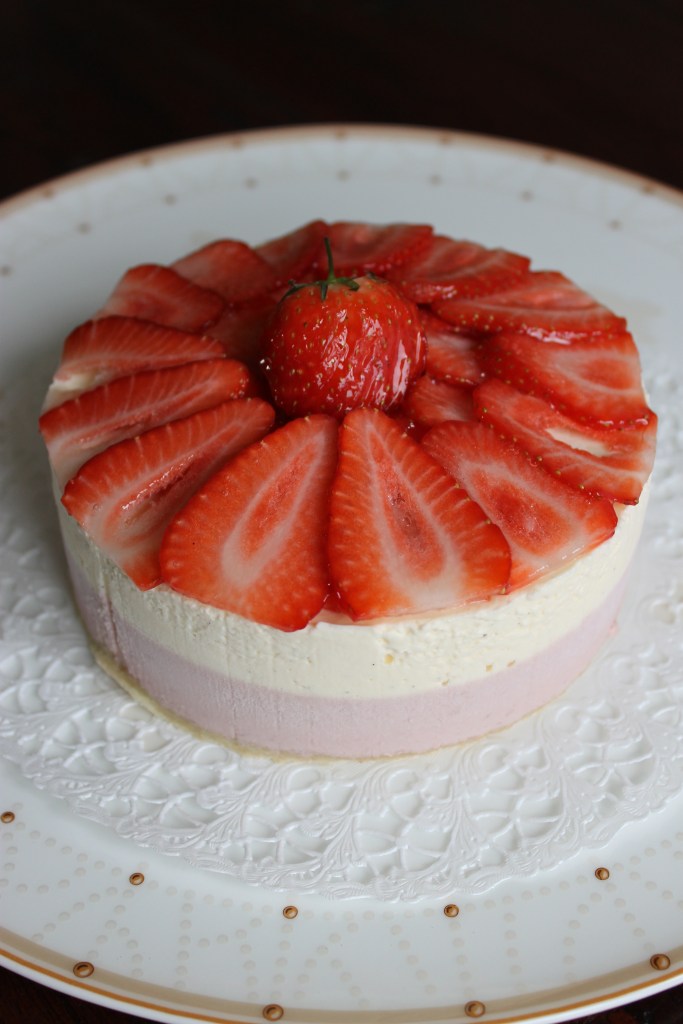 本来はスポンジ生地にバタークリームとフレッシュ苺を挟んでマジパンで表面をコーティングしたケーキですが、今回はムースにアレンジしました。